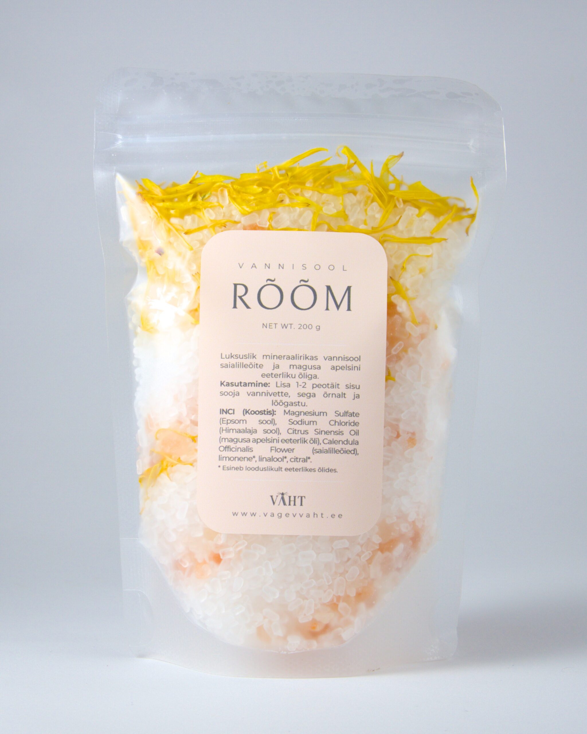 Tsitruseline vannisool RÕÕM sisaldab kõrgkvaliteedilist Euroopas toodetud Epsom soola, milles on kõrge magneesiumi ja väävli sisaldus. Magneesium on lõõgastava toimega, aidates leevendada lihaspingeid ja soodustades keha taastumist. Väävel toetab naha heaolu ning osaleb keha loomulikes taastumisprotsessides.